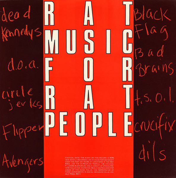 Not too long after I first began purchasing my own music, I stumbled across Rat Music For Rat People, a compilation album of U.S.* punk rock royalty playing live* in San Francisco, California between the years 1981-82*. The title excited newly minted, teenaged me. I had recently read James Herbert’s 1974 novel The Rats. My imagination ran hot at the possibility: Would there be songs about giant rats and their unwilling food sources?